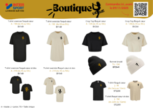 Venez ensuite récupérer vos commande le lundi 15 décembre 2025 de 19h à 20h à la salle de danse de l’IUFM (Boulevard Louis Blanc à La Roche sur Yon) ou mardi 16 décembre 2025 de 19h30 à 20h30 au studio de danse du lycée Pierre Mendès France (Boulevard Arago à La Roche sur Yon).