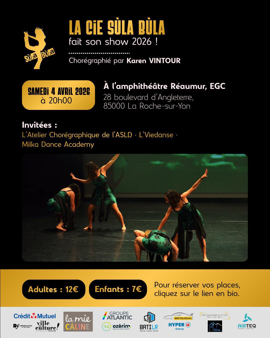 SPECTACLE COMPAGNIE SAMEDI 4 AVRIL 2026 Rendez-vous le samedi 4 avril 2026 à 20h00 à l’Amphithéâtre Réaumur, EGC 28 boulevard d’Angleterre à la Roche sur Yon. Pour réserver ta place c’est par ici https://www.helloasso.com/associations/sula-bula/evenements/spectacle-compagnies-04-04-2026