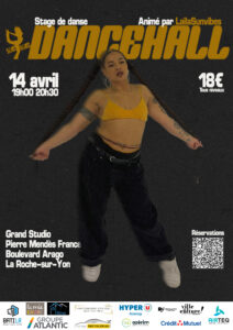 Rendez-vous mardi 14 Avril 2026 de 19h00 à 20h30pour un stage de Dancehall avec l’incroyable « Laïla sun vibes » au grand studio Pierre Mendes France, Boulevard Arago à la Roche sur Yon.