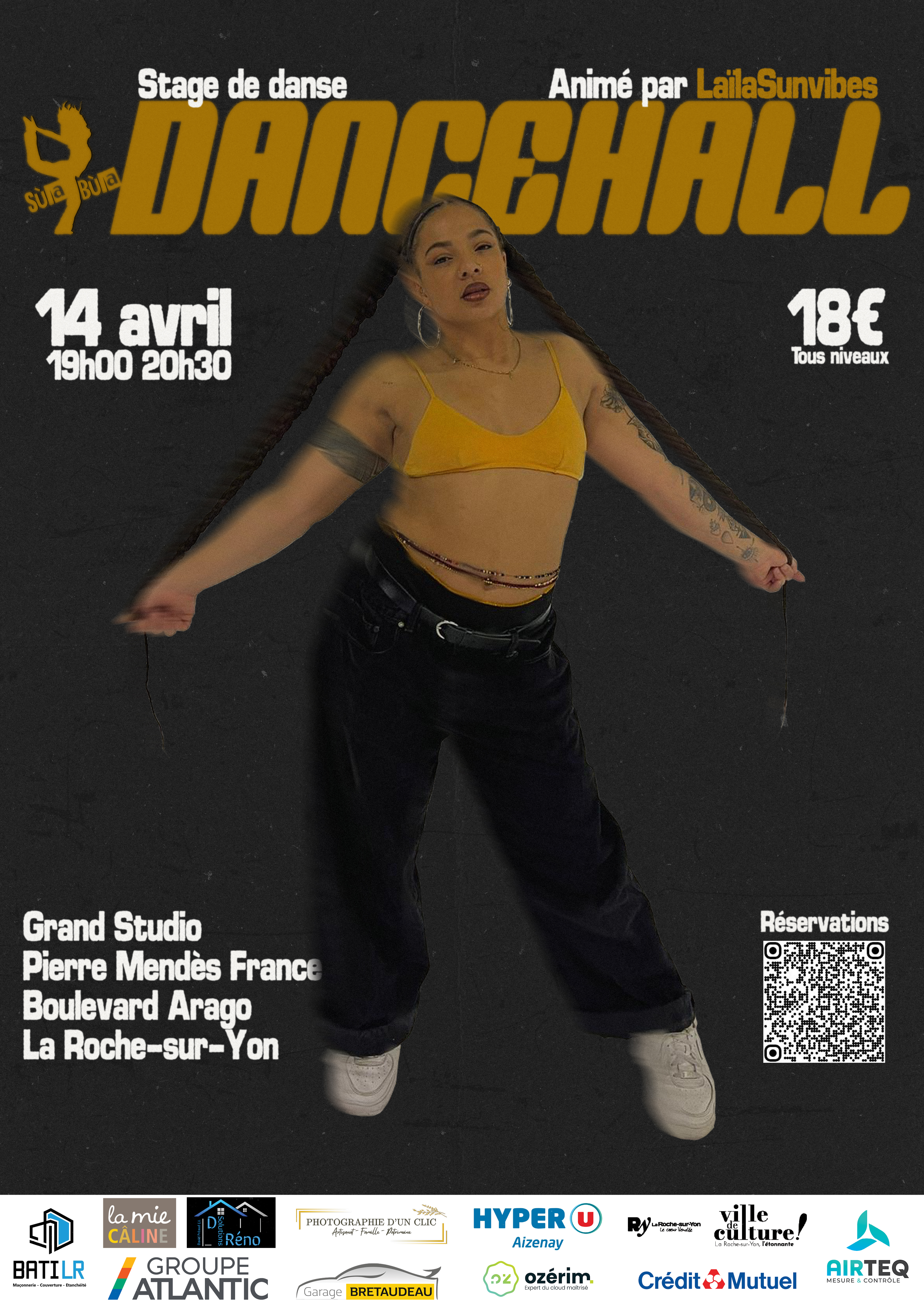 Rendez-vous mardi 14 Avril 2026 de 19h00 à 20h30pour un stage de Dancehall avec l’incroyable « Laïla sun vibes » au grand studio Pierre Mendes France, Boulevard Arago à la Roche sur Yon.